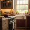 Warm lighting from a pair of antique-style lamps creates a welcoming glow, complemented by the flickering flames of the fireplace. The scent of burning wood mingles with the aroma of freshly brewed coffee, making this space the perfect retreat. Cozy rugs underfoot provide warmth and texture, while wall art featuring nature scenes brings the outdoors in, creating a peaceful escape just steps away from everyday life.